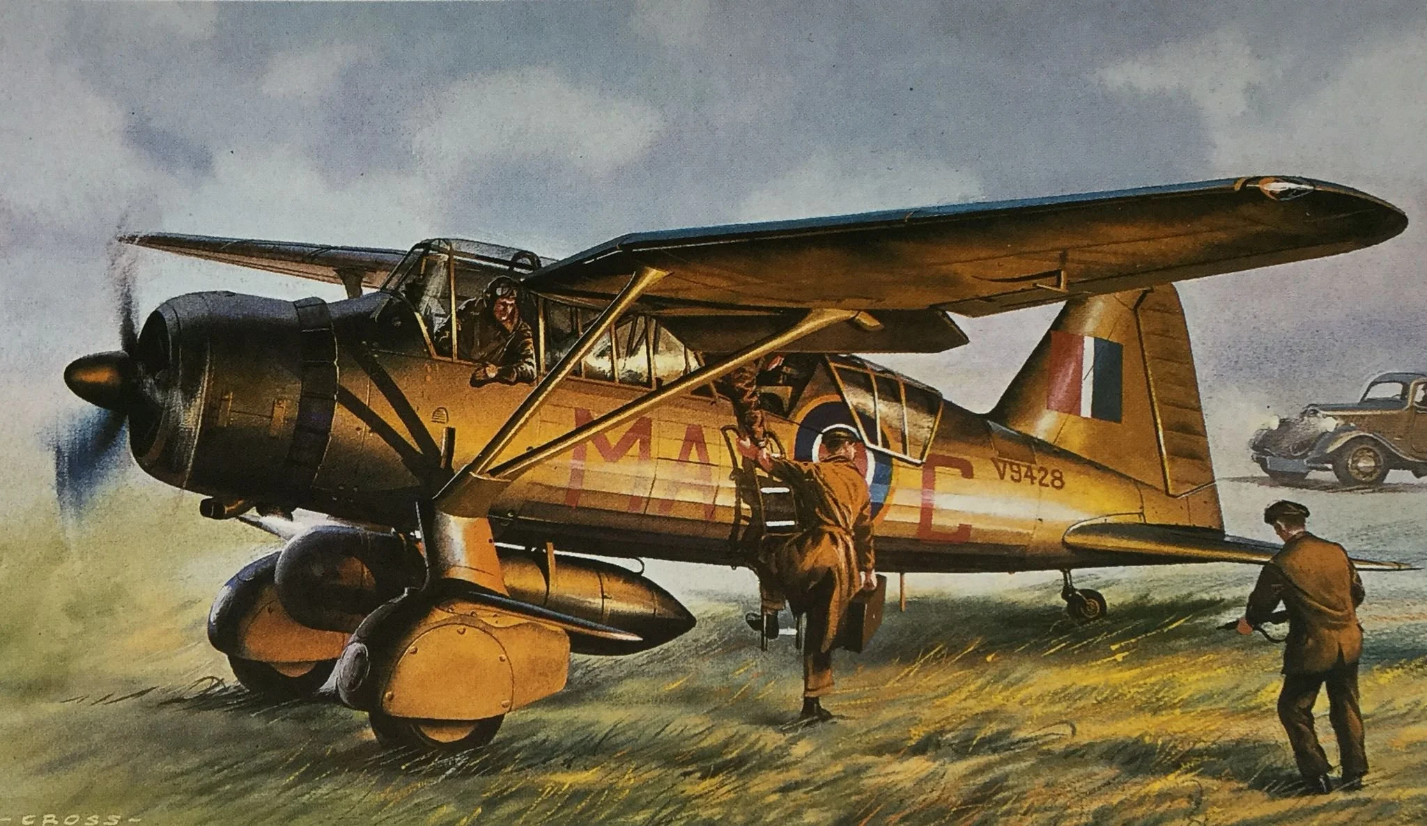 The Westland Lysander on the ground, at dusk with the engine running as an undercover agent, or spy, climbs aboard.