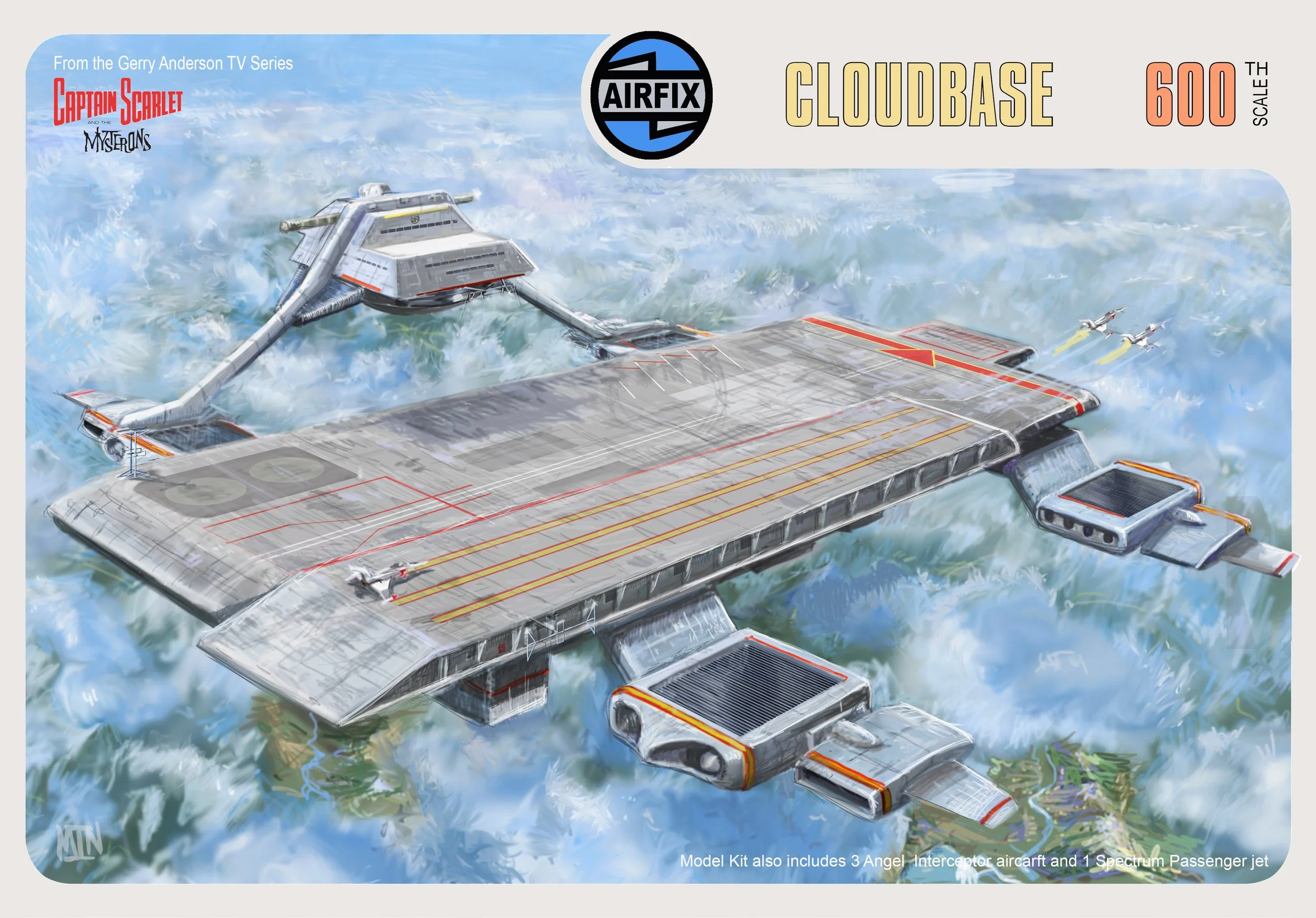1/600th was the scale used by Airfix for their battleships and ocean liners, and in this scale Cloudbase would be 14” in length, with a wingspan of 9”. An impressive model. It would probably require a special display stand, similar to the model ship stands. The kit would come with tiny Angler Interceptors and a Passenger Jet approx 1” in lengh.