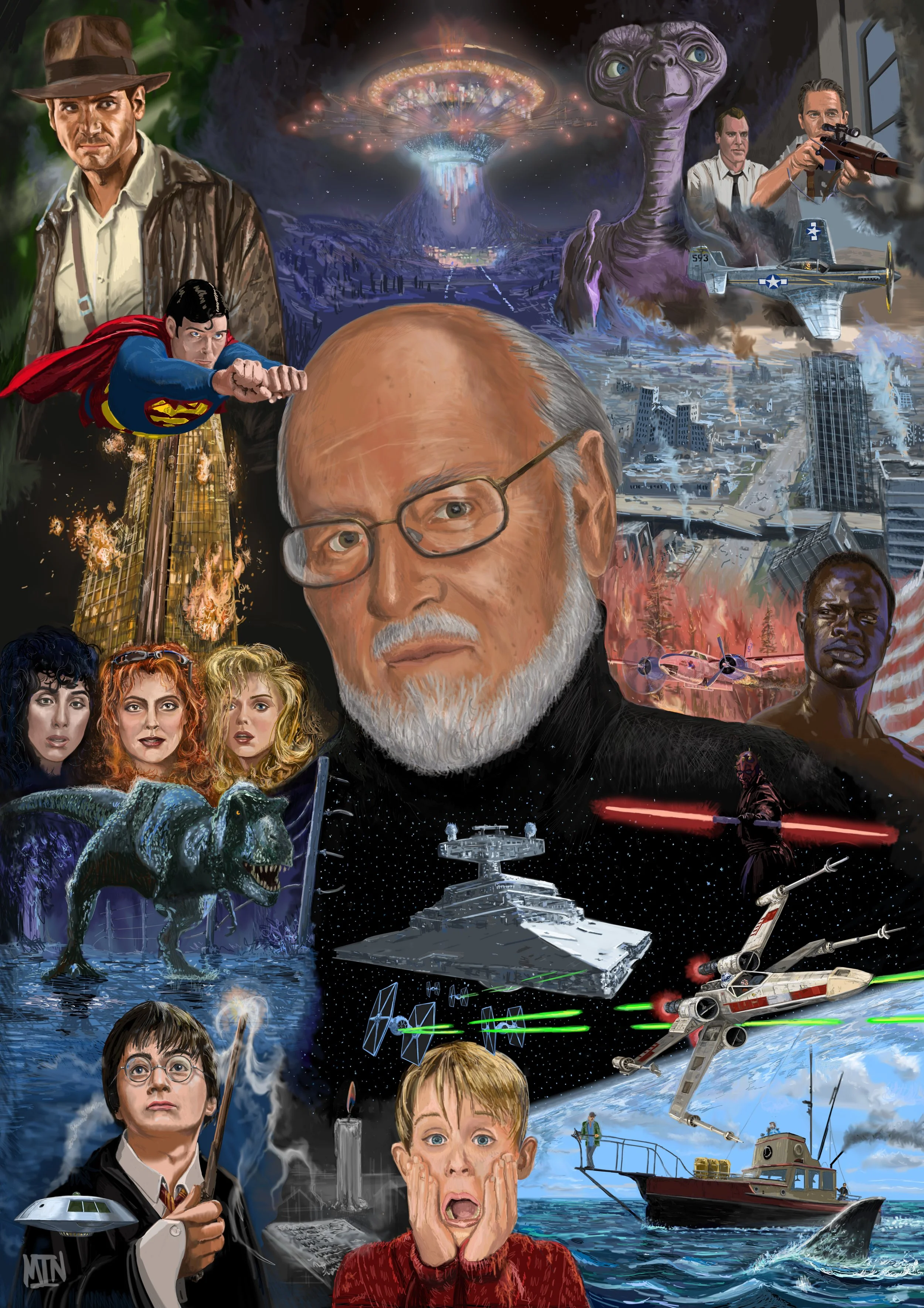 Projects shown here. Starting form the top, and going clockwise. ‘Close Encounters of the Third Kind’ (1977), ‘E.T. The Terrestrial’ (1982), ‘JFK’ (1991), ‘Empire of the Sun’ (1987), ‘Earthquake’ (1974). ‘Amistad’ (1997), ‘Always’ 1989, ‘Star Wars Episode I - The Phantom Menace’ (1999) ‘Star Wars’ (1977), ‘Jaws’ (1975). ‘Home Alone’ (1990), ‘Schindler’s List’ (1993), ‘Harry Potter and the Philosopher’s Stone’ (2001), ‘Lost In Space’ (1965), ‘Jurassic Park’ (1993). ‘The Witches of Eastwick’ (1987), ‘The Towering Inferno’ (1974), ‘Superman’ (1978), ‘Raiders of the Lost Ark’ (1981). Centre - The man himself circa 1990s