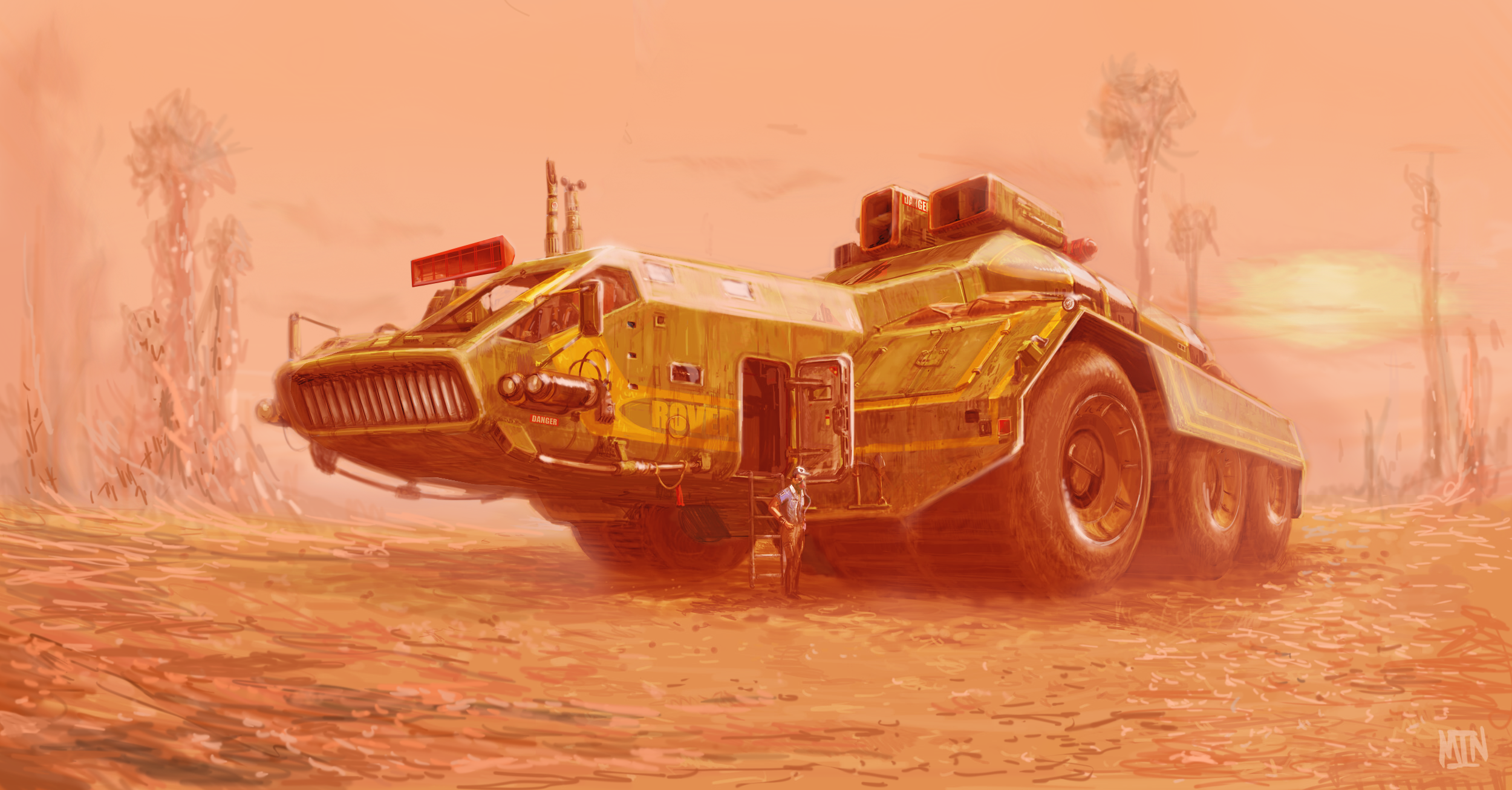A futuristic exploration vehicle. - the Rover - seen here on an alien planet. The vehicle is capable of high speed over rugged terrain and has numerous sensors and scanners and a laboratory in the rear. I wanted to evoke the sort of artwork seen on the covers of Sci-Fi novels in the 1970s.