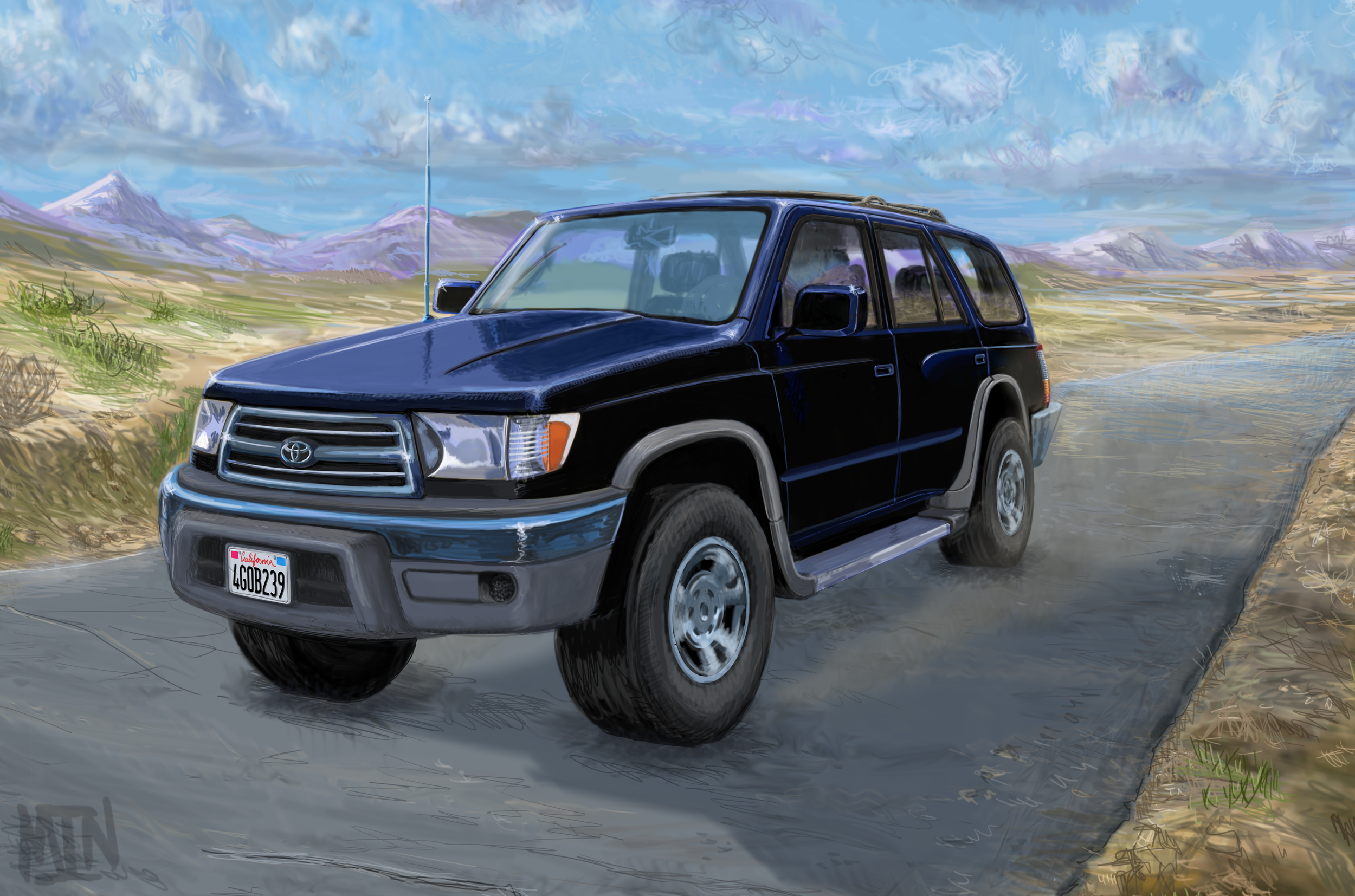 This is painting of my wife’s Toyota 4 Runner. this fantastic car took us across the country from San Diego to Toronto and back. Incredibly versatile and reliable, and with 200000 miles on the clock still going strong. Although like most of us it is starting to show, and I dare say feel, its age.